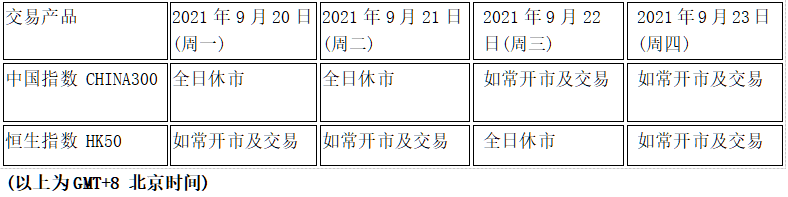因应2021年9月20日至9月22日(周一至周三)为国内及香港中秋节假期,本公司以下产品的交易时间将于假期期间作以下安排,敬请留意。