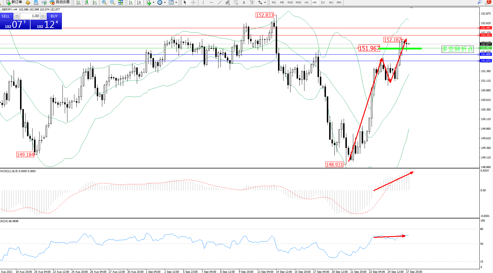 交易策略:151.967上方看涨,目标152.301、152.491