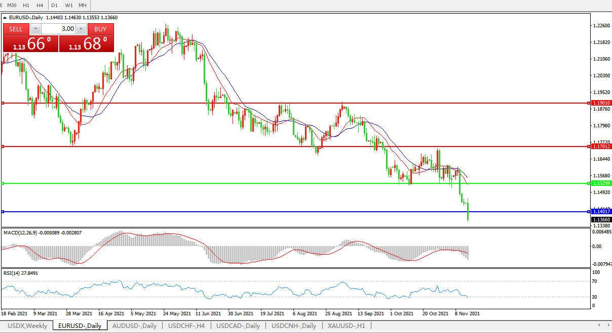 技术面简析:日图均线再度呈空头排列,汇价延续骤跌,MACD运行于0轴下且量能稍微放量,RSI拐头下行 ,预计短期汇价大概率将进一步下行。