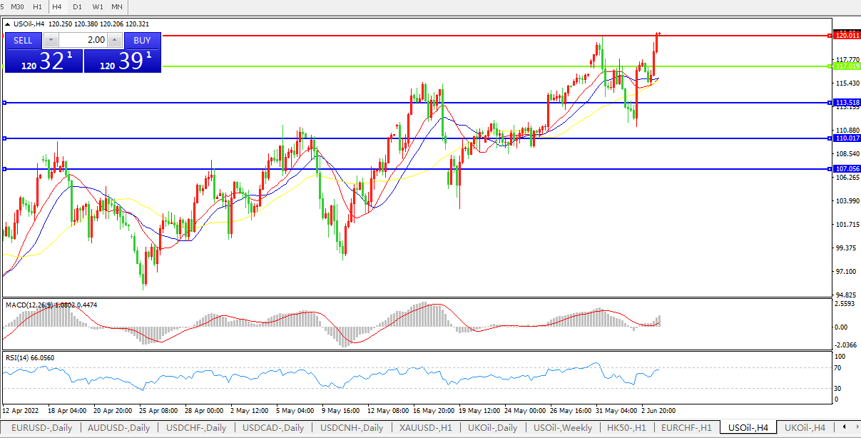 美油涨上120美元关口,市场认为欧佩克的增产计划不会立即改善全球供应紧张局面,而且随着抗疫封锁措施的放松,原油市场需求还会更加紧张。