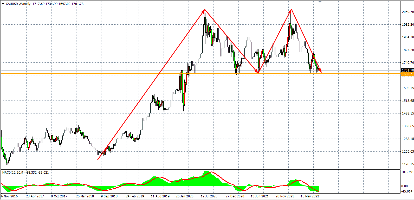 黄金周线级别走势,双顶已在构建中,结合时间点分析,9月-11月期间均有下破颈线位置1680美元的可能,美联储的加息动向将决定是否形成头部结构,同时决定下半年的行情法方向走势。