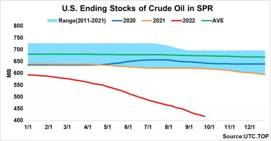 对于美国总统而言,目前最现实可行的选项工具仍然是释放战略储备库存,自美国总统拜登在今年3月份宣布目标释放战储1.8亿桶以来,目前已经可以统计的销售量已经达到1.65亿桶,根据美国国会在2015年和2018年的相关法案,美国政府在2023财政年度仍然需要强制销售的战略准备原油至少还有2600万桶,也就是说,目前拜登总统手里可以动用的战储原油筹码数量是1.8-1.65+0.26=0.41亿桶,值得指出的是,美国2023年财政年度是从2022年10月1日开始的,也就是说,除了今年尚未释放完成的,拜登还可以在国会既定授权之下随时追加2600万桶的释放增量。