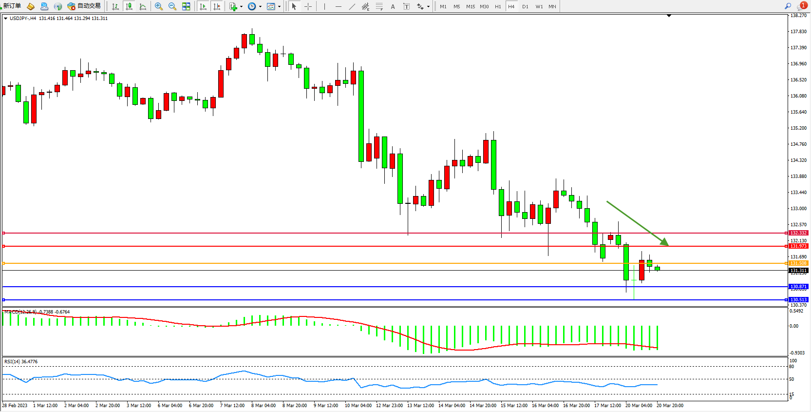 4小时图看:空头动力延续下行趋势走势持续,市场整体处于偏空头情绪下,不断下移中,MACD指标处于空头区域低位整理,RSI指标处于50继续下侧空头区域弱势徘徊;