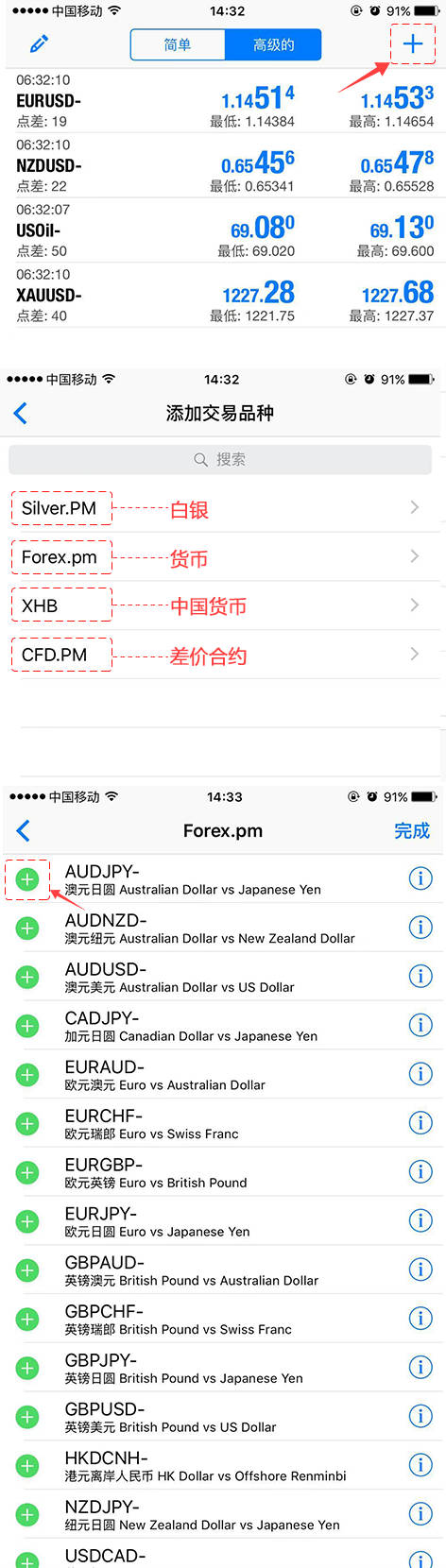 2.点击行情页面右上角的【+】,添加交易品种。